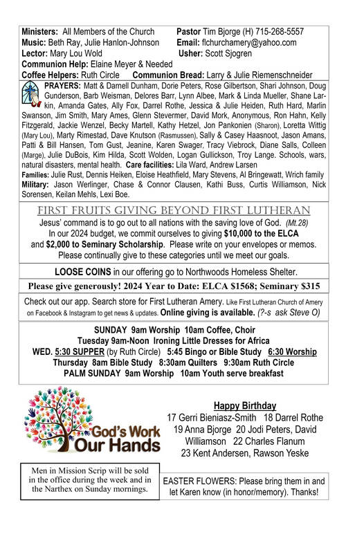 Youth Update 4/2/2025Youth Update 4/5/2025Congregational Update: April 4, 2025Bulletin: April 5, 2025Congregational Update: April 11, 2025Bulletin: April 13, 2025Congregational Update: April 17, 2025Bulletin: April 20, 2025 Easter SundayCongregational Update: April 25, 2025Bulletin: April 27, 2025Youth Update 4/27/2025