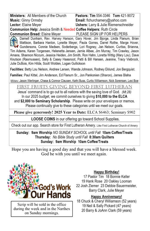 Bulletin: August 3, 2025Congregational Update: August 1, 2025Bulletin: August 10, 2025Congregational Update: August 8, 2025Bulletin: August 17, 2025Congregational Update: August 15, 2025Bulletin: August 24, 2025Congregational Update: August 22, 2025Youth Update August 28, 2025Bulletin: August 31, 2025Congregational Update: August 29, 2025