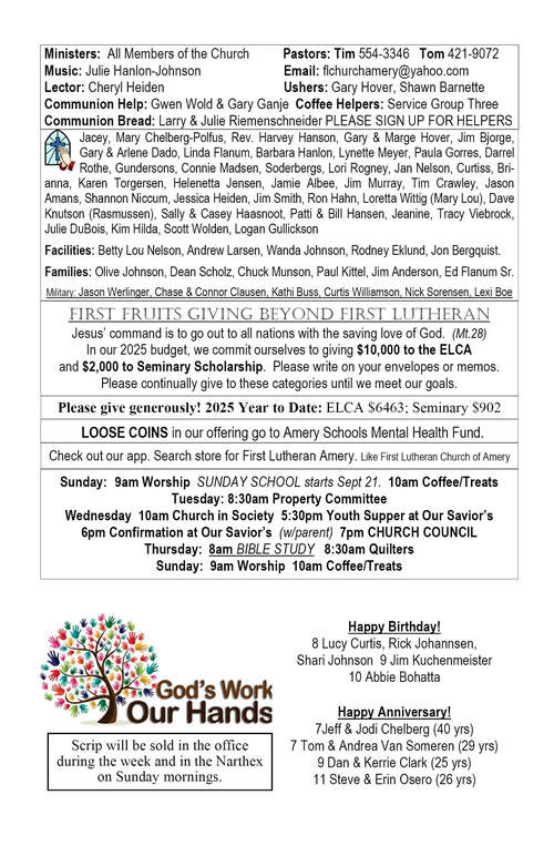 Bulletin: August 3, 2025Congregational Update: August 1, 2025Bulletin: August 10, 2025Congregational Update: August 8, 2025Bulletin: August 17, 2025Congregational Update: August 15, 2025Bulletin: August 24, 2025Congregational Update: August 22, 2025Youth Update August 28, 2025Bulletin: August 31, 2025Congregational Update: August 29, 2025