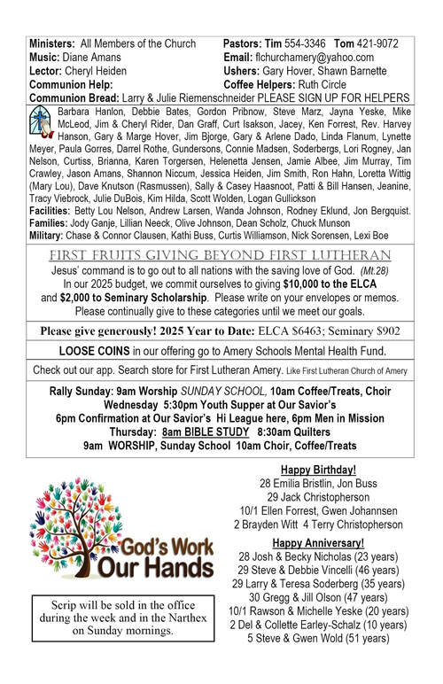 Bulletin: August 3, 2025Congregational Update: August 1, 2025Bulletin: August 10, 2025Congregational Update: August 8, 2025Bulletin: August 17, 2025Congregational Update: August 15, 2025Bulletin: August 24, 2025Congregational Update: August 22, 2025Youth Update August 28, 2025Bulletin: August 31, 2025Congregational Update: August 29, 2025