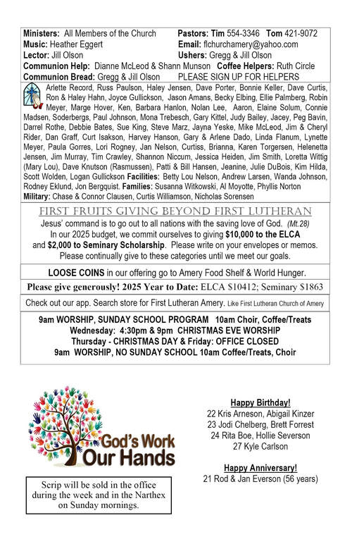 Bulletin: January 5, 2025Congregational Update: 1/3/2025Youth Update 1/3/2025Congregational Update: 1/10/2025Bulletin: January 12, 2025Youth Update 1/10/2025Congregational Update: 1/17/2025Bulletin: January 19, 2025Congregational Update: 1/24/2025Youth Update 1/25/2025Bulletin: January 26, 2025Congregational Update: 1/31/2025Bulletin: February 2, 2025